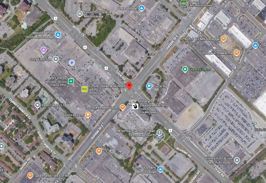 Image shows general area of the collision at the intersection of Dixie Road and Dundas Street East.