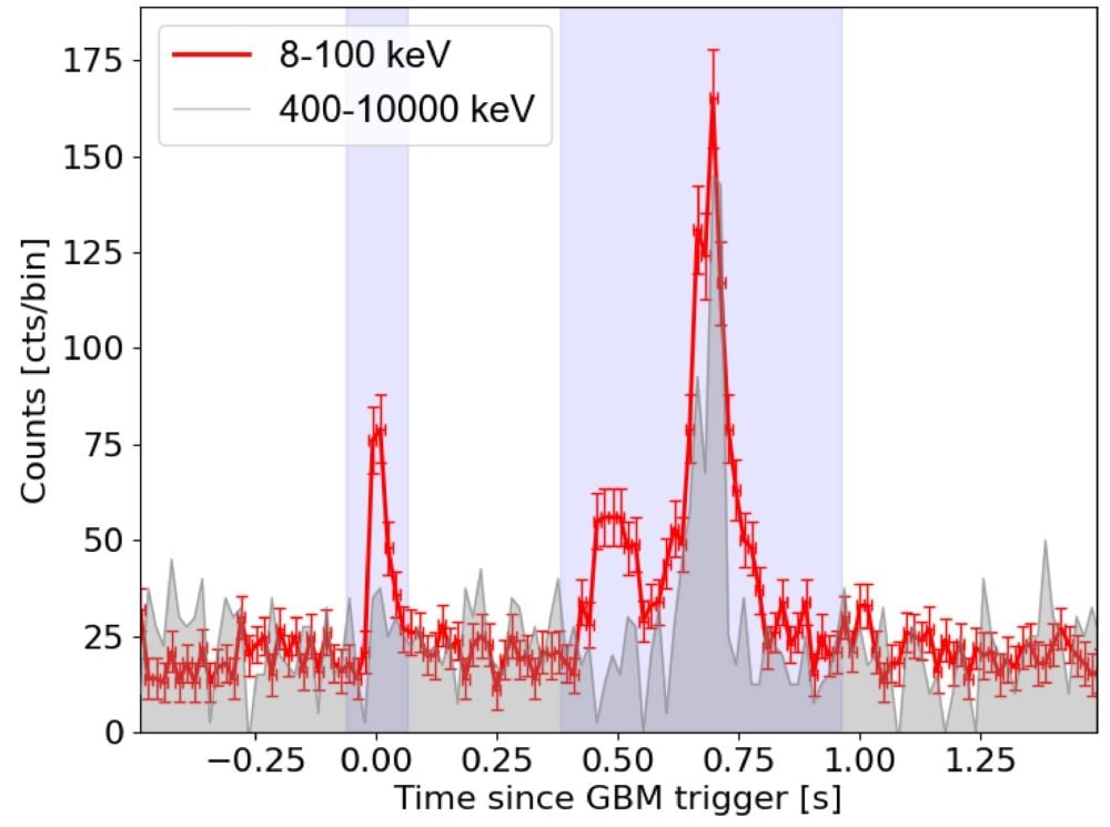 This is the Fermi/GBM light curves of GRB 230609A in two energy bands: 8–100 keV are hard x-rays and 400–10,000 keV is gamma-rays. The purple shaded regions highlight the first peak and the main episode. Image Credit: Dichiara et al. 2026. ApJL *This is the Fermi/GBM light curves of GRB 230609A in two energy bands: 8–100 keV are hard x-rays and 400–10,000 keV is gamma-rays. The purple shaded regions highlight the first peak and the main episode. Image Credit: Dichiara et al. 2026. ApJL*