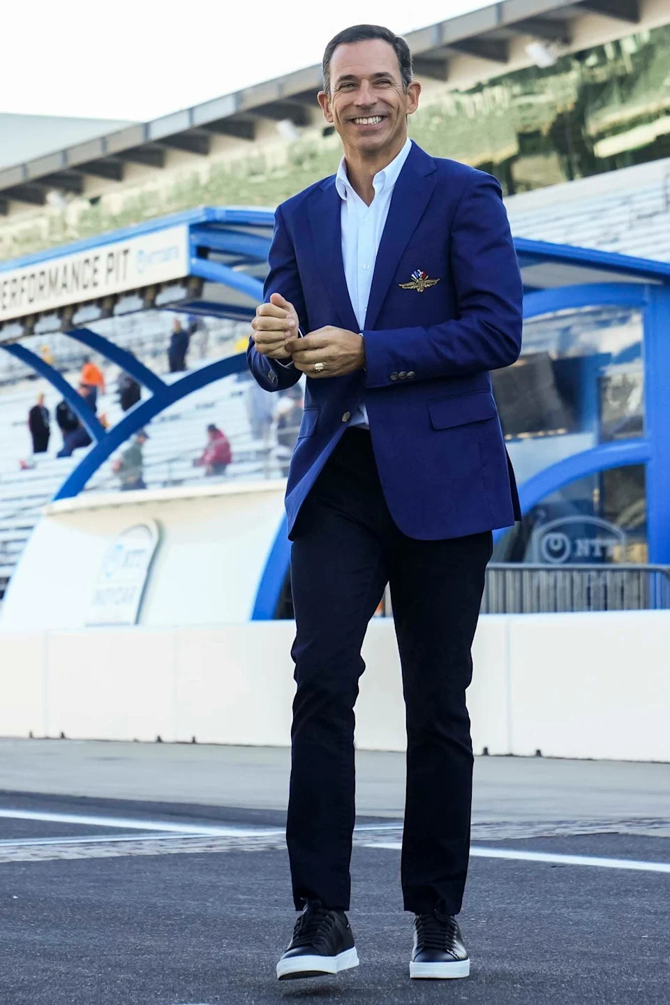 Helio Castroneves walks onto the track Friday, May 23, 2025, On Carb Day ahead of the 109th running of the Indianapolis 500 at Indianapolis Motor Speedway.