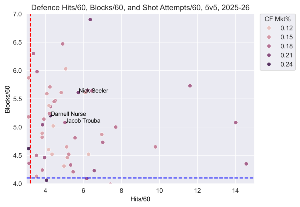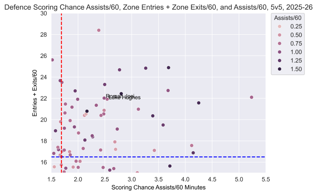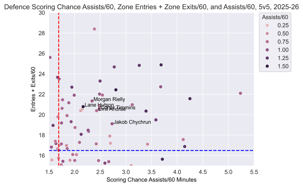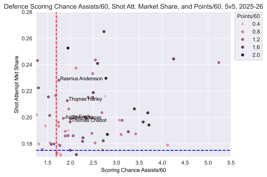 Harley does have an interesting profile in 2025-26, though. When looking at defencemen scoring chance assists, the percentage of their respective team’s shot attempts they take when they’re on the ice, and including only those with an above-average points rate, four names pop up: