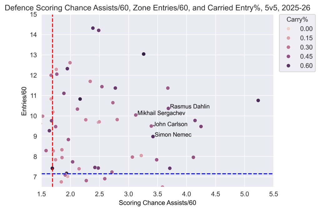 There is a group of young defencemen in the league who all have roughly the same kind of profile: very good puck skills, good in transition, but are unreliable defensively so it’s keeping their coaches from leaning on them consistently. Andrae fits that bill, so do Olen Zellweger and Pavel Mintyukov in Anaheim, and Nemec is also included. To show this, here are Nemec’s closest comparable blue liners by the aforementioned scoring chance assists, zone entries, and percentage of zone entries carried in (all hallmarks of a defenceman with very good puck skills):