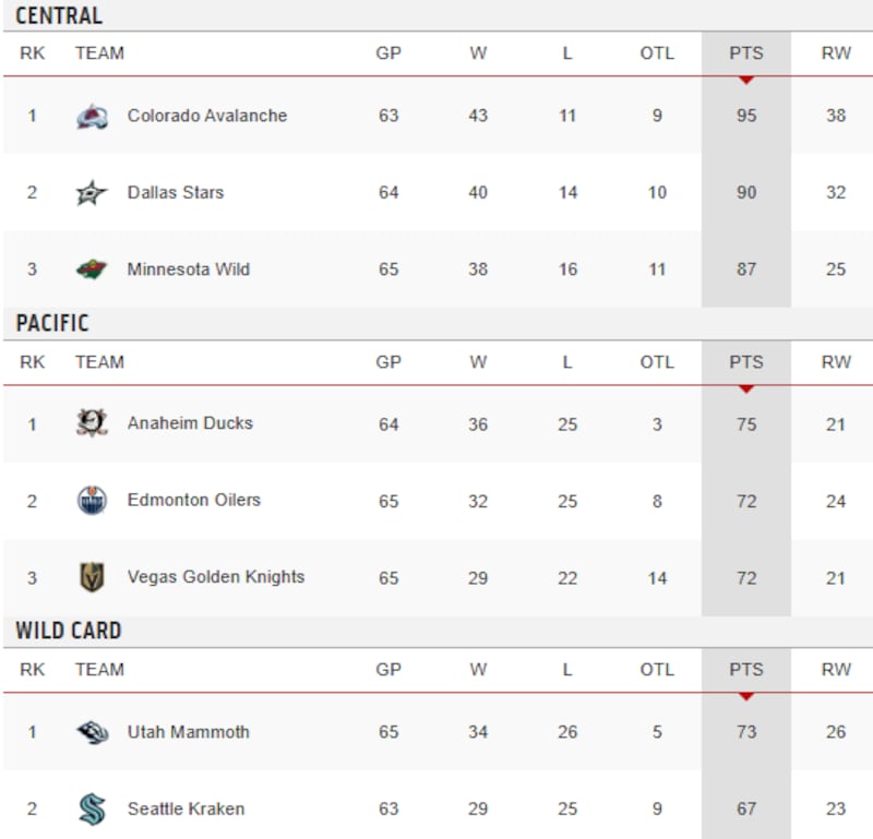 The Avalanche, Stars and Wild appear locked in to to the top three spots in the Central Division, with the third-place Wild sitting 14 points ahead of the fourth-place Utah Mammoth. Colorado holds the Division lead, three points up on Dallas and eight points up on Minnesota.
