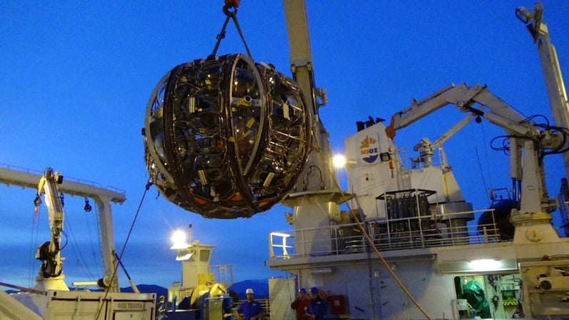 The KM3NeT LOM (Launching vehicle of Optical Modules) being loaded onto the RV Pelagia deployment vessel. A full string detection is rolled onto the LOM. After arrival at the seabed the string is unrolled to its full length (Credit : Edewolf) The KM3NeT LOM (Launching vehicle of Optical Modules) being loaded onto the RV Pelagia deployment vessel. A full string detection is rolled onto the LOM. After arrival at the seabed the string is unrolled to its full length (Credit : Edewolf)