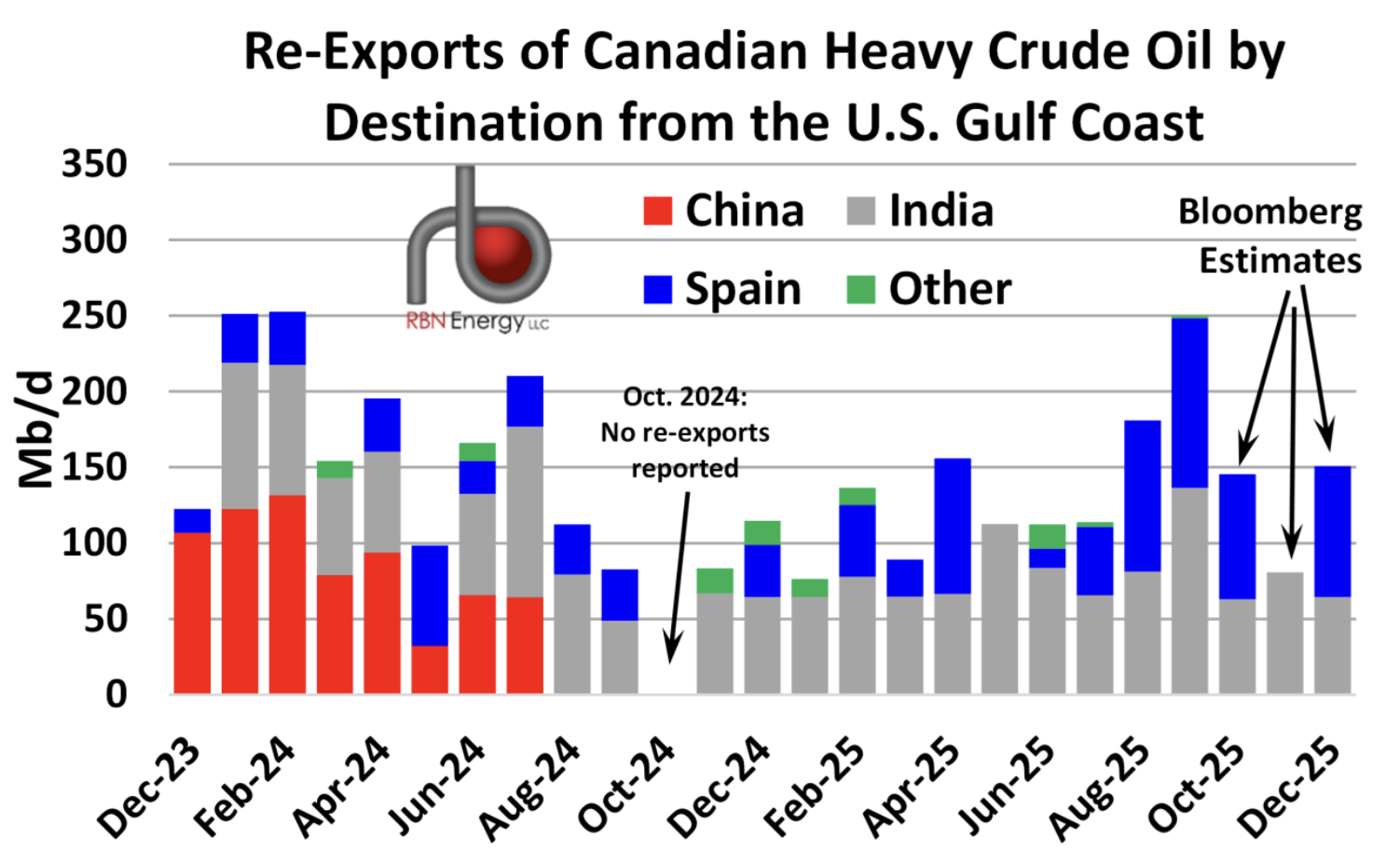 While China leads overseas sales from Trans Mountain, India is a regular buyer of U.S. Gulf Coast re-exports, according to RBN Energy.