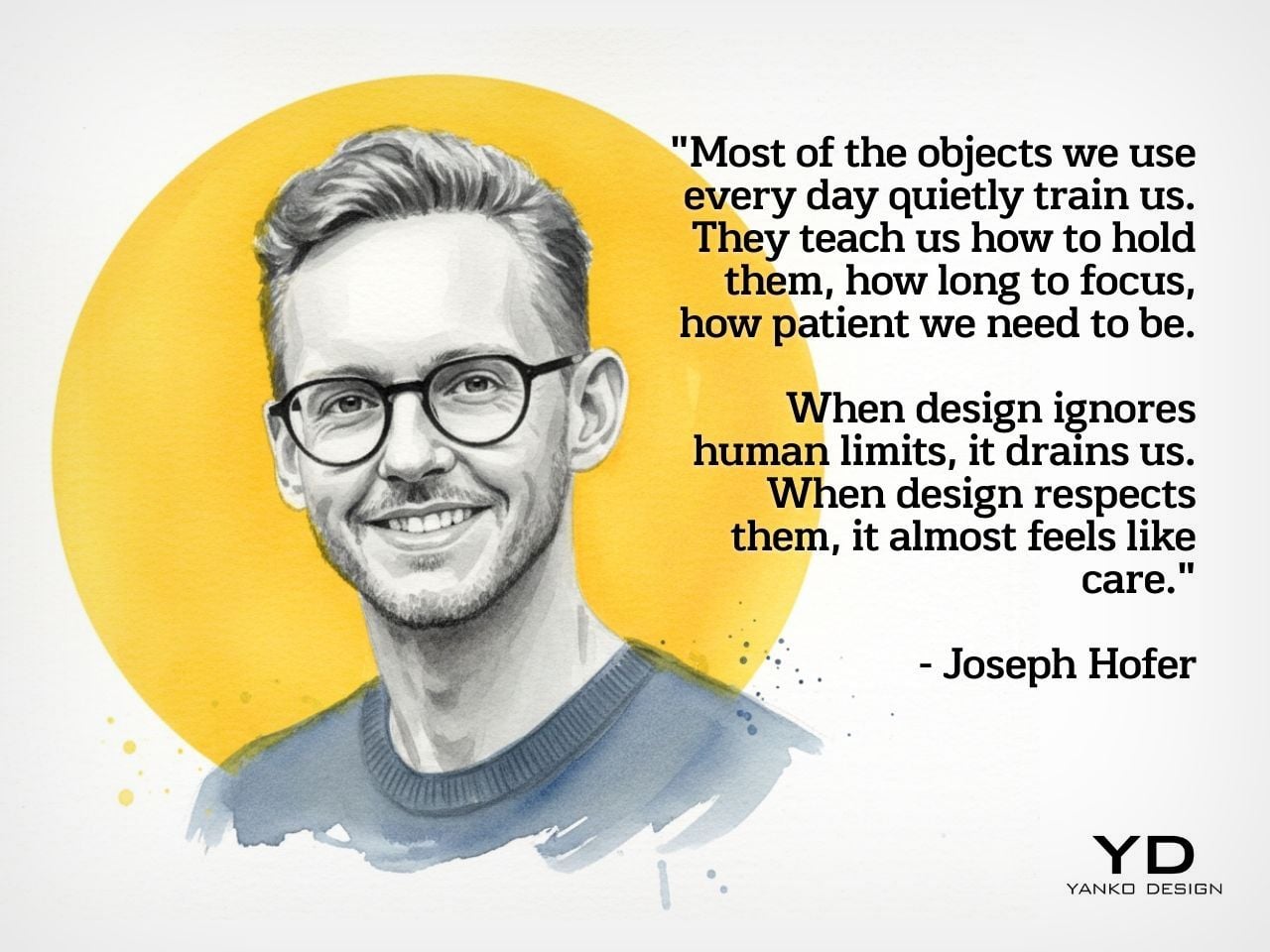 Joseph opens the conversation with something that sounds almost poetic but lands with the weight of a core design principle, saying that “most of the objects we use every day quietly train us. They teach us how to hold them, how long to focus, how patient we need to be. When design ignores human limits, it drains us. When design respects them, it almost feels like care.” He critiques what he calls “sticky” experiences, the kind that benefit companies at users’ expense, arguing that the real question designers should be asking is whether a product helps people become a better version of themselves, or whether the company simply wins after ten years of draining them.