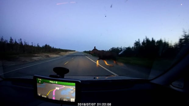 A moose runs out from the shadows of a ditch and strikes a vehicle travelling on the Trans-Canada Highway