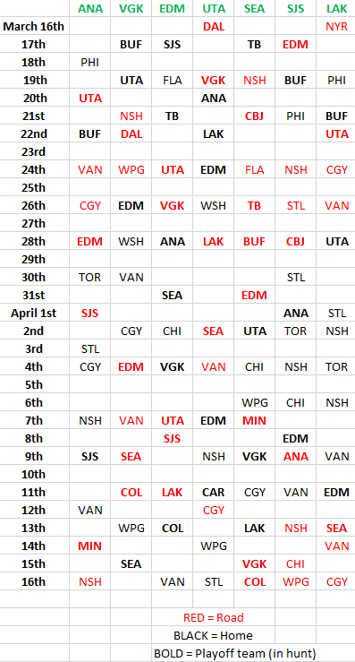 ANA: 77 points with eight home games and seven road games. They have six games v. teams in the playoff hunt.