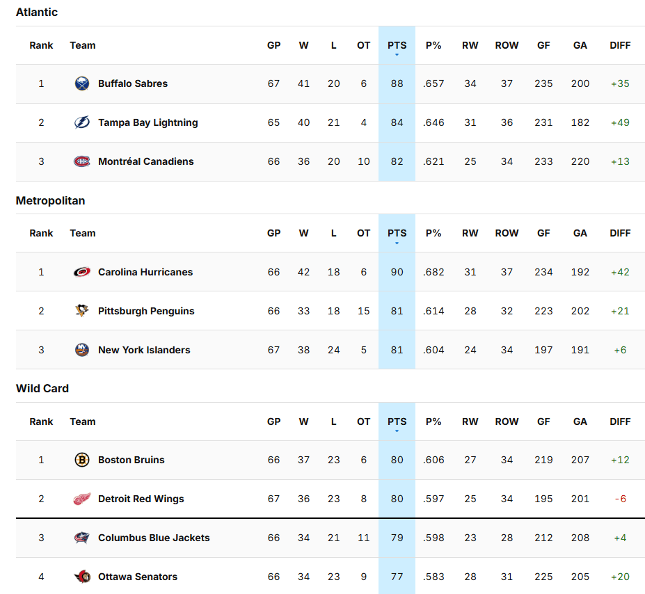 Pittsburgh, New York and Columbus are battling for second and third in the Metro and a possible Wildcard spot, while Montreal, Boston, Detroit are pushing for third in the Atlantic and a Wildcard spot.