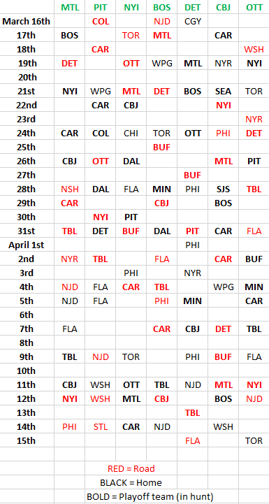 MTL: 82 points with eight home games and eight road games. They have 10 games v. teams in the playoff hunt.