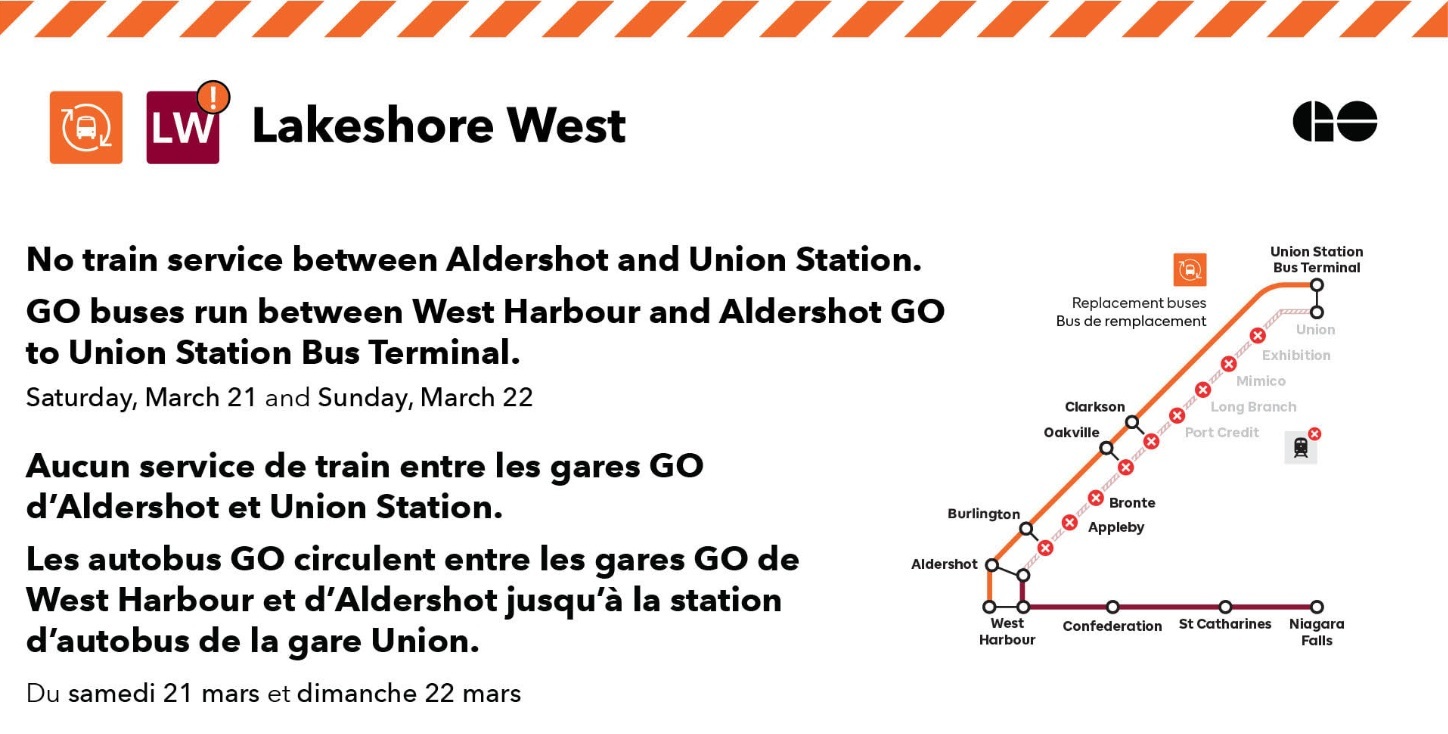 GO replacement buses will operate, making stops at West Harbour, Aldershot, Burlington, Oakville and Clarkson GO stations, then run express to Union Station Bus Terminal in Toronto.