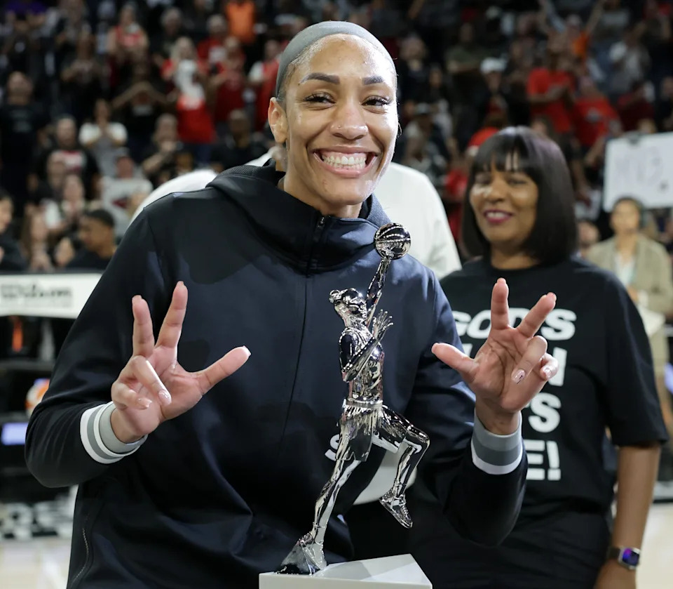 A’ja Wilson #22 of the Las Vegas Aces smiles after receiving the 2024 WNBA MVP award before Game One of the 2024 WNBA Playoffs first round between the Aces and the Seattle Storm at Michelob ULTRA Arena on September 22, 2024 in Las Vegas, Nevada.