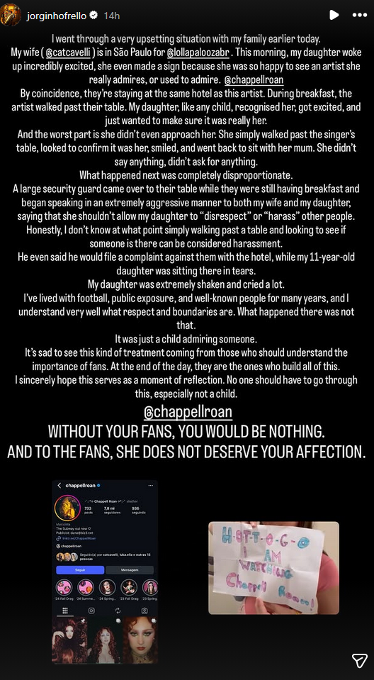 “I went through a very upsetting situation with my family earlier today. My wife [Catherine Harding], is in São Paulo for Lollapalooza Brasil. This morning, my daughter woke up incredibly excited. She even made a sign because she was so happy to see an artist she really admires, or used to admire,” Jorginho wrote on social media, referring to Roan, who is expected to perform at the music festival in São Paulo today.