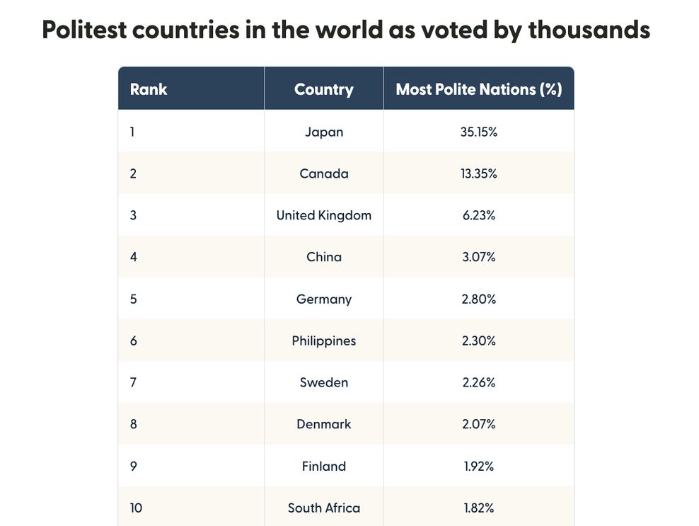 Canada takes second place with 13.35 per cent of survey participants ranking it as one of the most polite countries in the world.