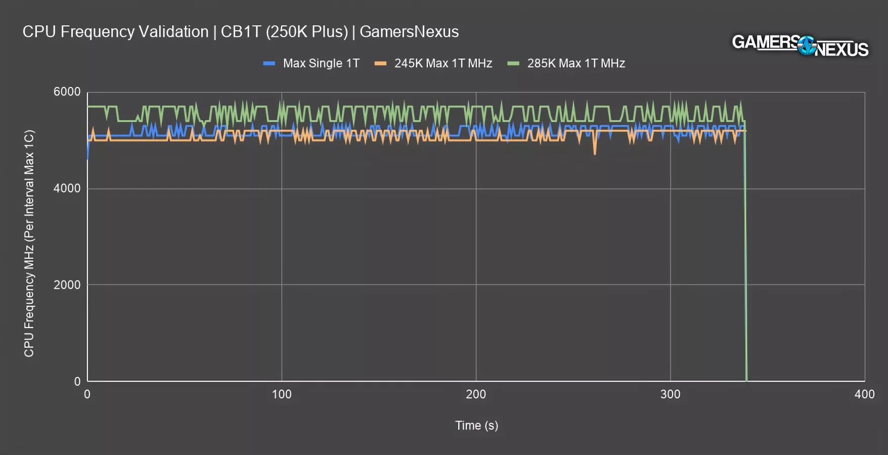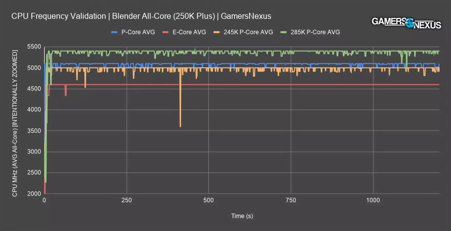 Adding the 245K for reference, the predecessor averaged 5 GHz even for most of this test. The dip down in the center is a logging anomaly from the test process and can be ignored. In general, the new CPU is 100-200 MHz faster.