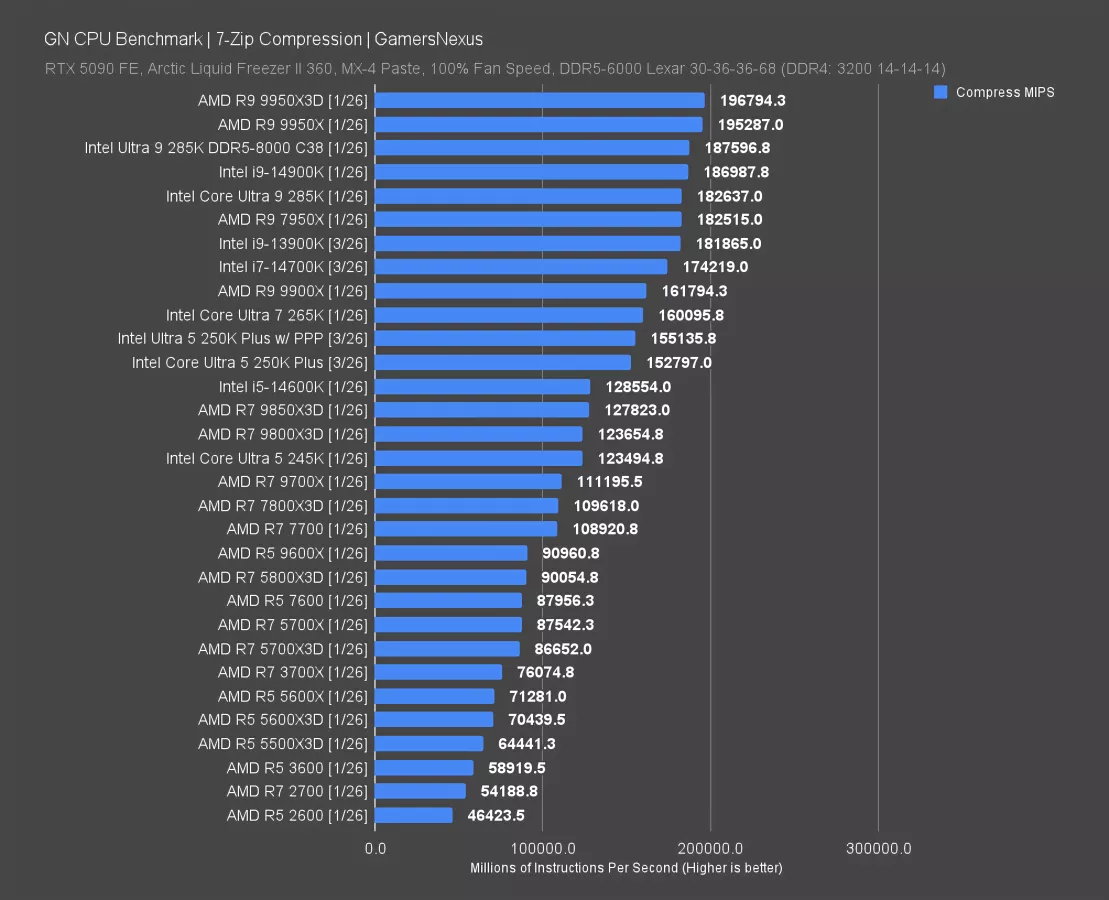 AMD’s 9600X is far down here, which isn’t news for the 6-core part in production tests. Intel’s 250KP has a 71% lead over the 9600X in this compression test, which is starting to feel like a mirror of 2017 AMD where production was its only real bastion of hope before it made gaming work.