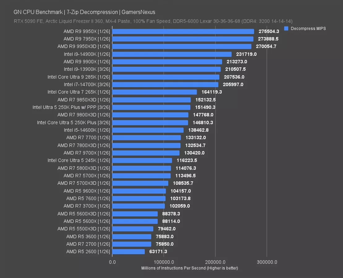 Decompression testing is next. In this test, the 250K Plus completed 146.8K MIPS, which matched it with the 9800X3D. The 8-core X3D CPUs have never been impressive in this test, as most of their benefit is in gaming. Enabling PPP pushed it up to 151K MIPS, an improvement from without PPP of 3.2%.