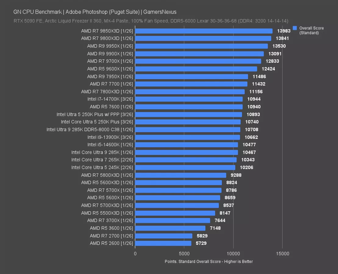 As for AMD’s 9600X, which is its main price competition right now, that’s 14% ahead. AMD generally does well in Photoshop testing via the Puget Suite right now, which is a flip from several years ago when Intel used to be the holdout in this test.