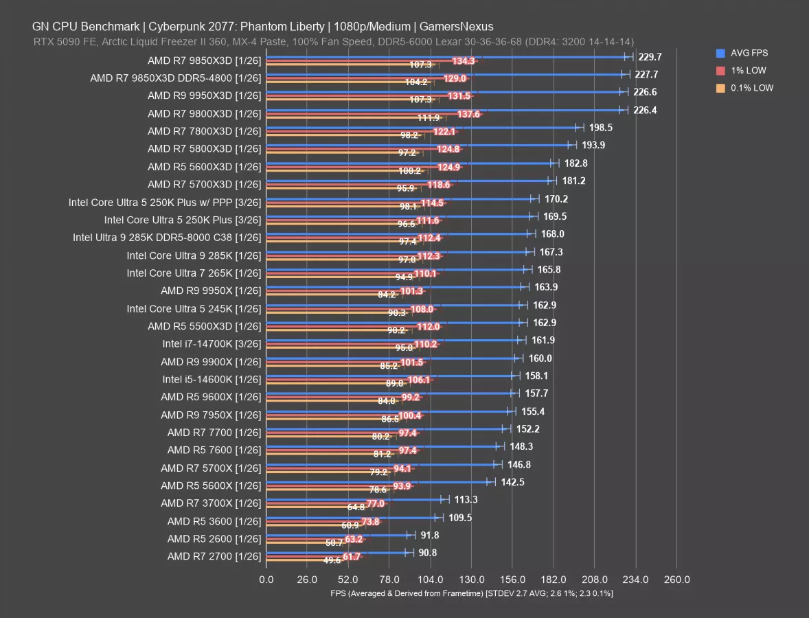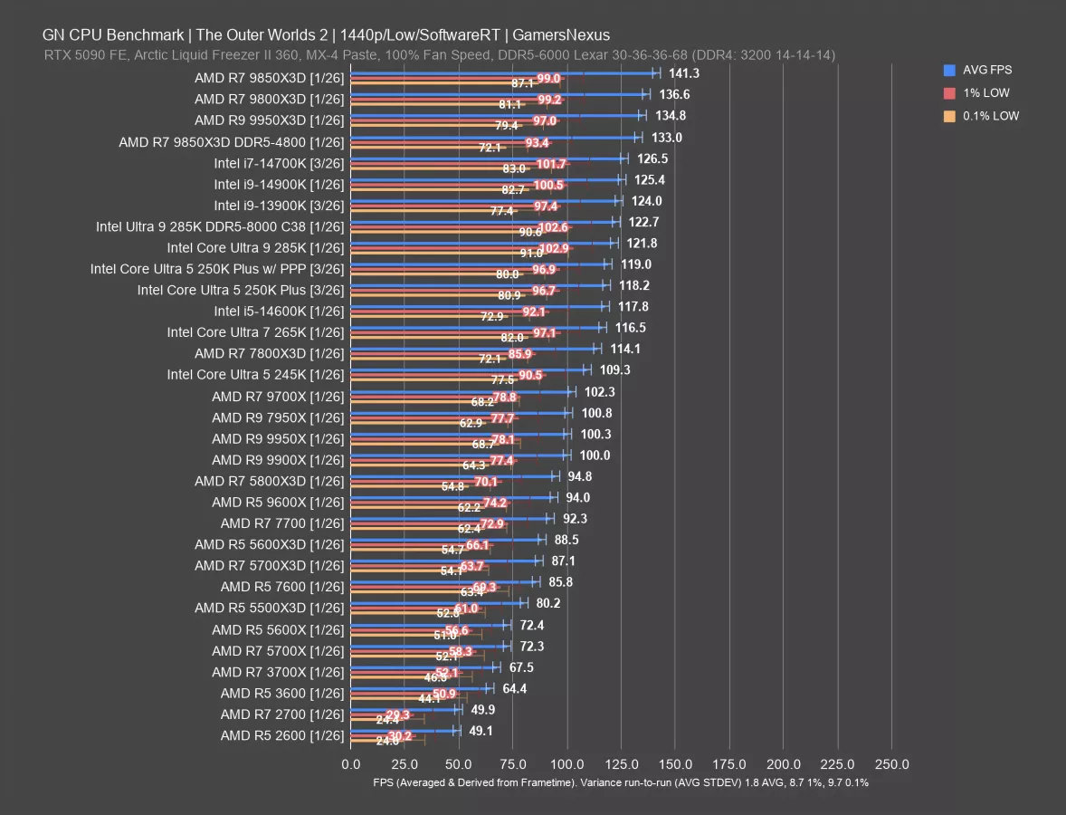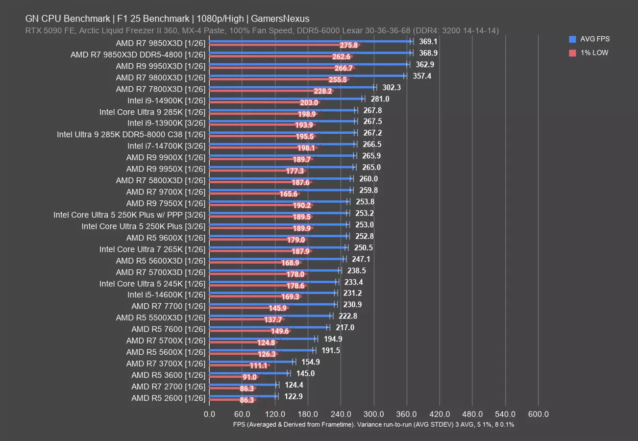 In this game, the 5600X3D and 5700X3D CPUs don’t do as disproportionately well as some other games. They’re still good, but the 250KP ends up ahead of them. As you’d expect, the 9800X3D and its refresh end up at the top of the chart but remain in a different price class.