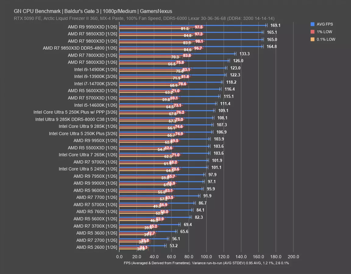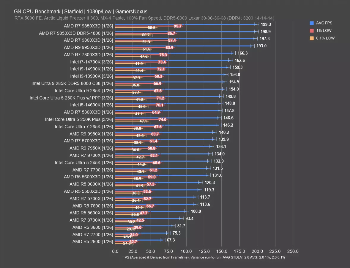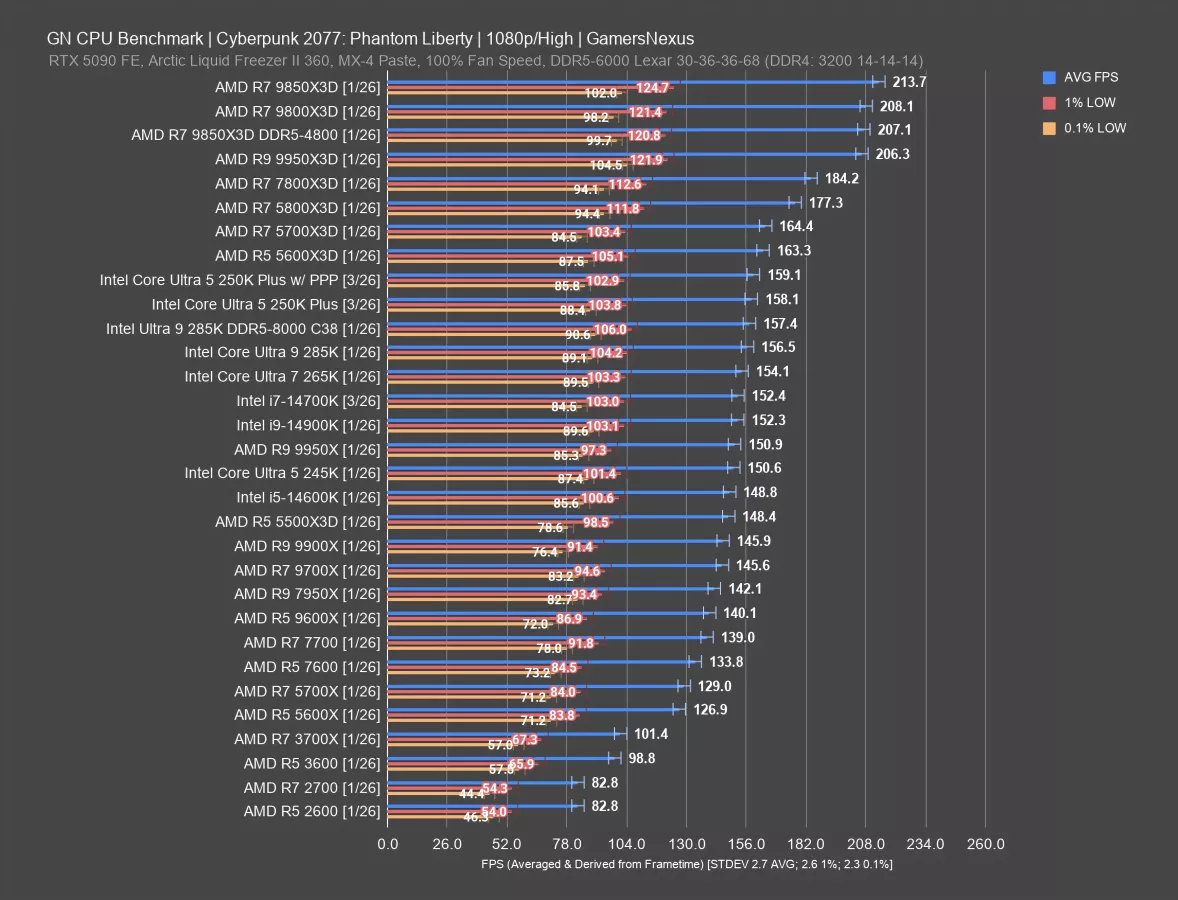 In this game, the 5600X3D and 5700X3D CPUs don’t do as disproportionately well as some other games. They’re still good, but the 250KP ends up ahead of them. As you’d expect, the 9800X3D and its refresh end up at the top of the chart but remain in a different price class.