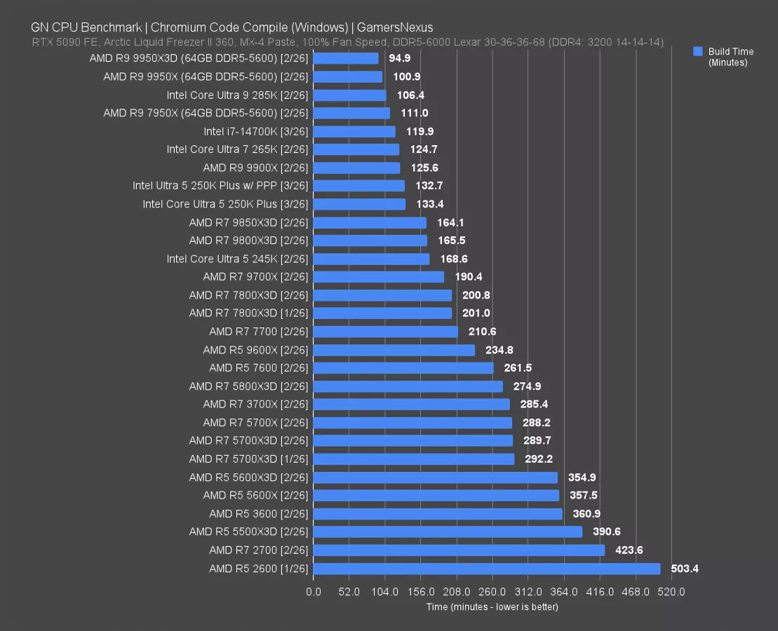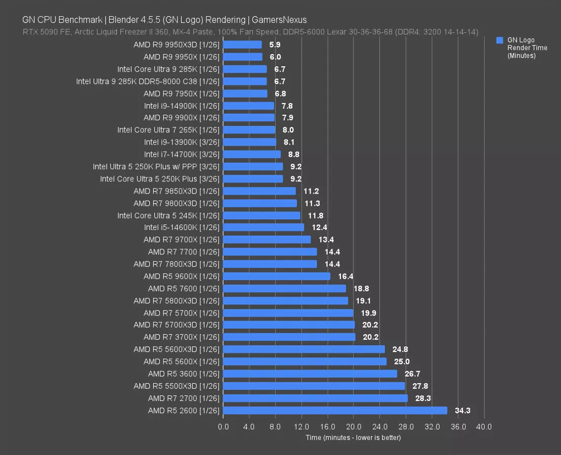This is a highly core-dependent benchmark, so CPUs like the 8-core X3D parts fall below performance of higher thread count CPUs. This is also why the 6-core 9600X struggles in this one, down at 16.4 minutes render time. That means the 250KP required 44% less time than the 9600X.