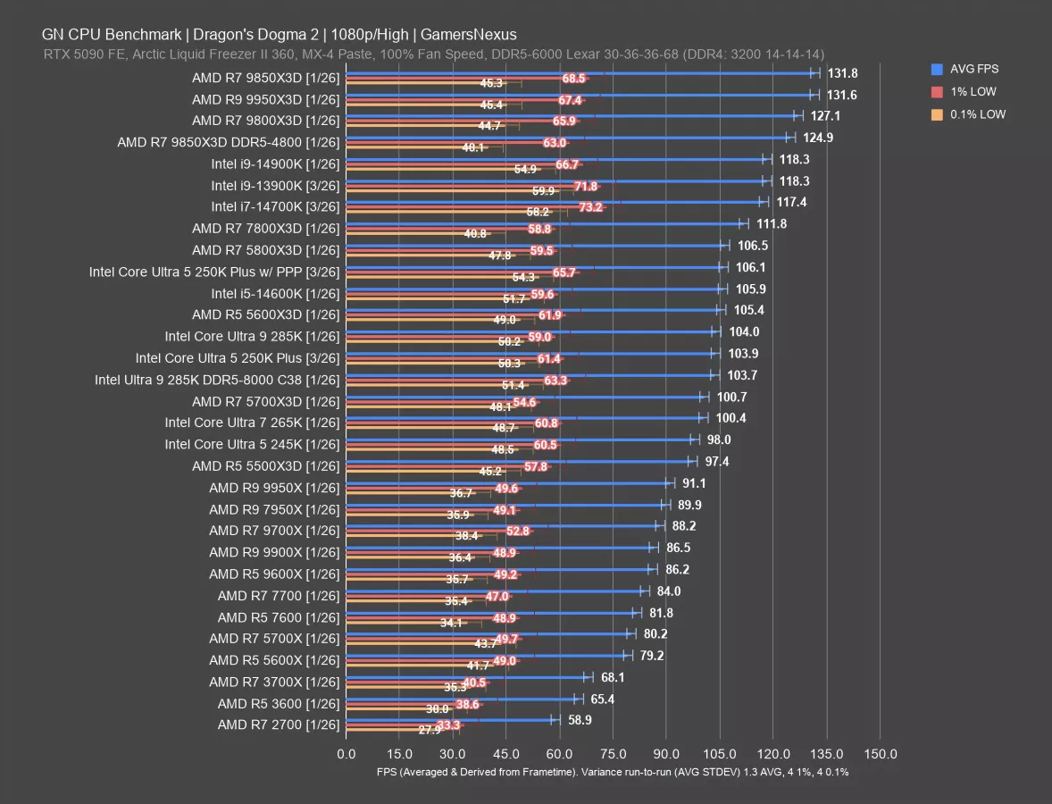 AMD’s top CPUs here are all functionally the same in performance, with no real advantage to the 16-core parts versus some of its better 8-core parts. We don’t have the 14900K retested in this one anytime recently and were too busy benchmarking Crimson Desert to go back for it, but we do have the 14700K. The 14700K has about the same overall score as the 250KP and R5 7600 in this test, which matches the results we had in this test a little over a year ago in terms of relative scaling.