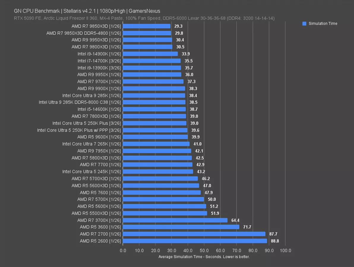 AMD’s gaming-class CPUs haven’t been as competitive in this test as Intel in a while: X3D isn’t really built for this, with the cache helping less than more cores or higher clocks on something like the 9800X3D, which is slower than the 250K Plus.