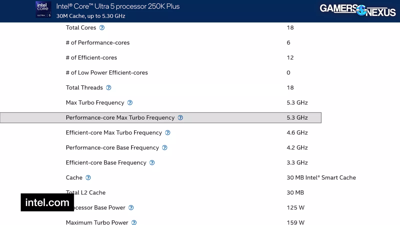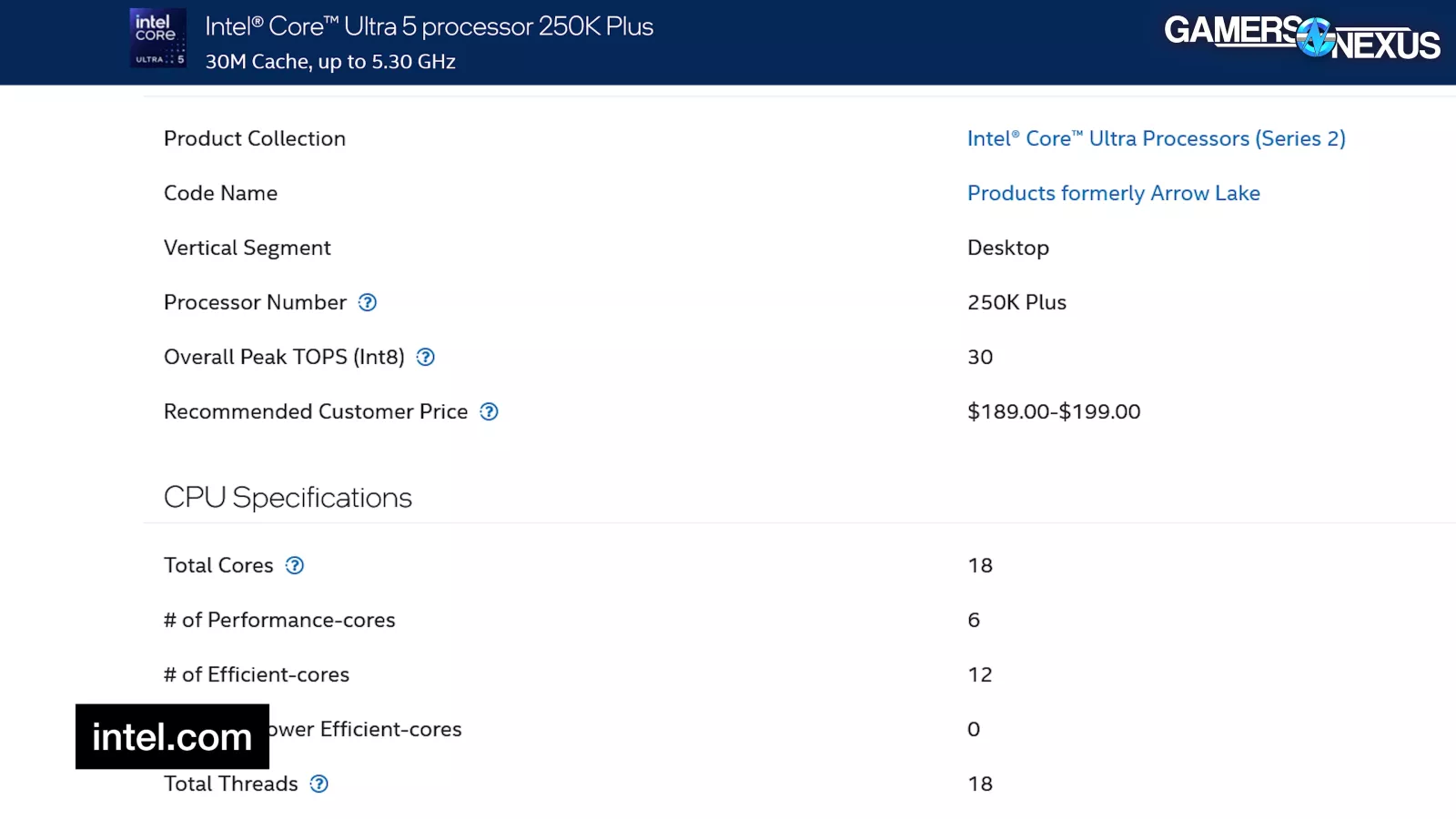 Intel’s new 250K Plus CPU is in the former i5 lineup and should be $190 to $200. The 250K Plus is running a 6 P-Core, 12 E-Core configuration for an 18C/18T spec at a 5.3 GHz max advertised boost. TDP is claimed at 159W for the 250K Plus, although TDP and actual power don’t match exactly. Intel is also now claiming native support for up to DDR5-7200 on the 250KP (up from 6400 previously), so… great, higher-end memory is supported.