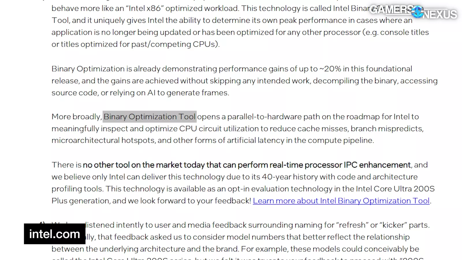 Intel also talked a lot of game about its Binary Optimization Tool, which it says “opens a parallel-to-hardware path […] for Intel to inspect and optimize CPU circuit utilization to reduce cache misses, branch mispredicts, microarchitectural hotspots, and other forms of artificial latency in the compute pipeline.”