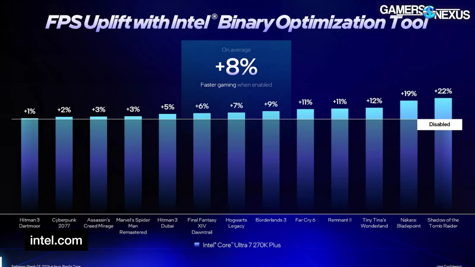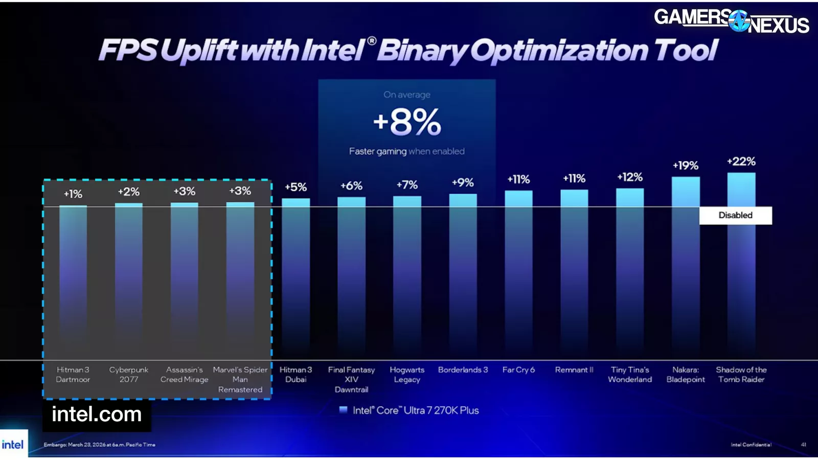 As for the claimed uplift, one-third of these games get under 3% improvement. Half of those are 1-2% different, which would be indistinguishable from test noise. Intel claims 6% in Final Fantasy and 2% in Cyberpunk. It is claiming 22% in Shadow of the Tomb Raider.