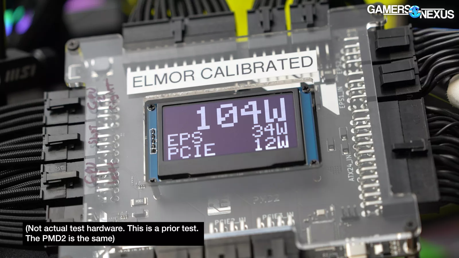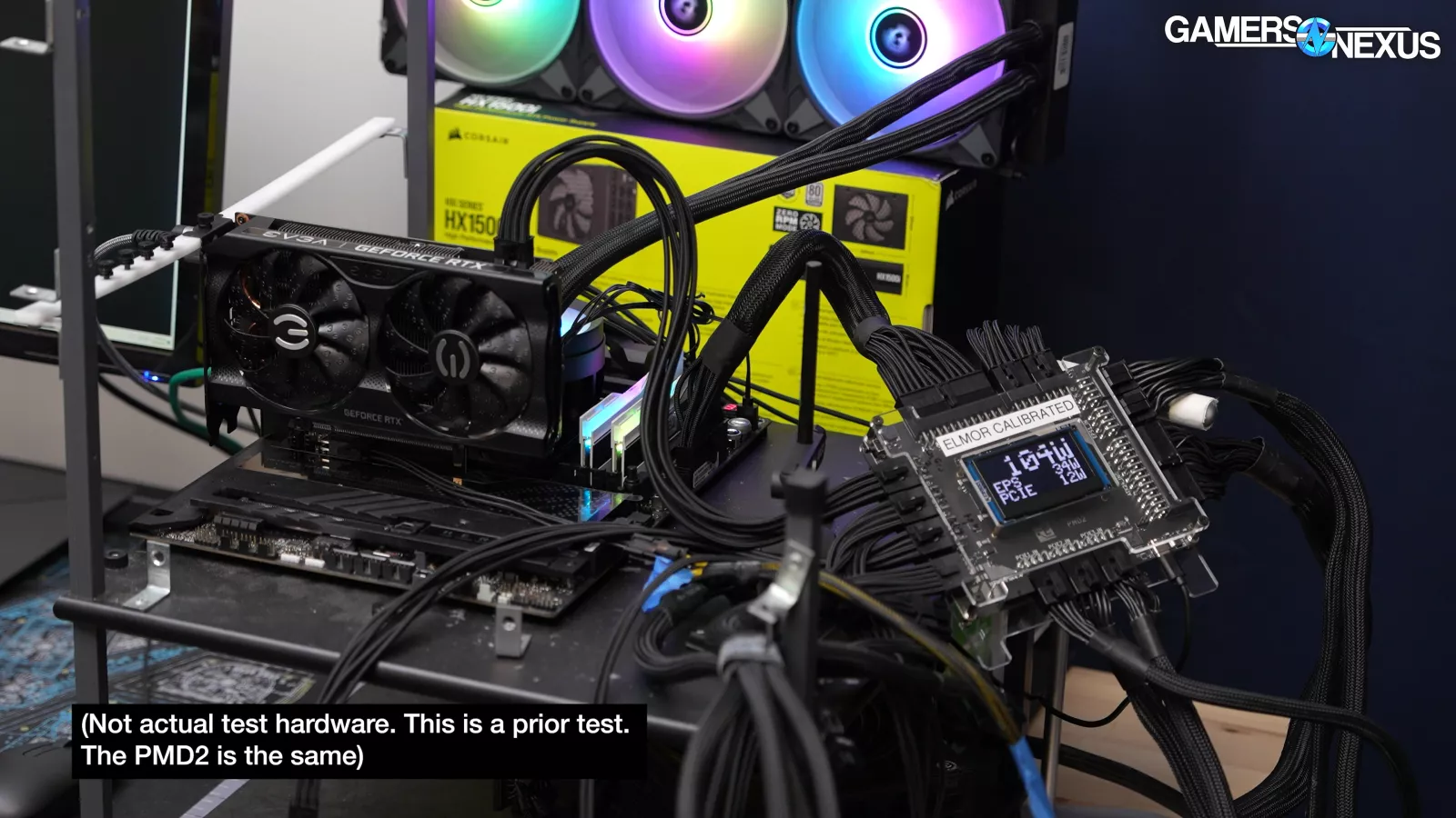 Now for our power test. This time, since the team was busy, we are keeping it pretty simple. For this testing, we set up a PMD2 as an interposer between the power supply and the test bench. So, there’s an external capturing device. It captures all the power delivered to the bench because the motherboard we’re using splits some of the 24 pin power to the CPU, which is abnormal. We take the ATX 12volt power, the EPS 12volt power, add them together, but we subtract out the PCIe slot, which we do by isolating the PCIe slot on a riser card strictly for this testing. So, that card is not there for the performance testing. And then we have some overhead for losses for VRM efficiency and other 12-volt parts on the board.