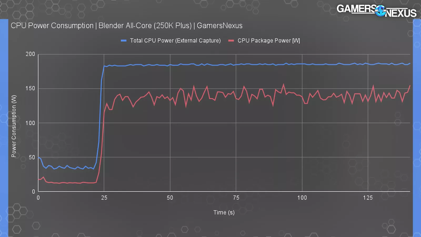 It’s not perfect, but it works pretty well. This test shows power consumption of the 250K Plus during an allcore Blender workload, which will be the worst case power draw scenario for the CPU. The external capture utilities using the method described have us at about 186 watts for the CPU. VRM efficiency losses and miscellaneous board components. That’s higher than TDP, but that’s also expected when taking external measurements. For reference, a CPU package power measurement using hardware info software yields around 140 to 150 watts in the same test.