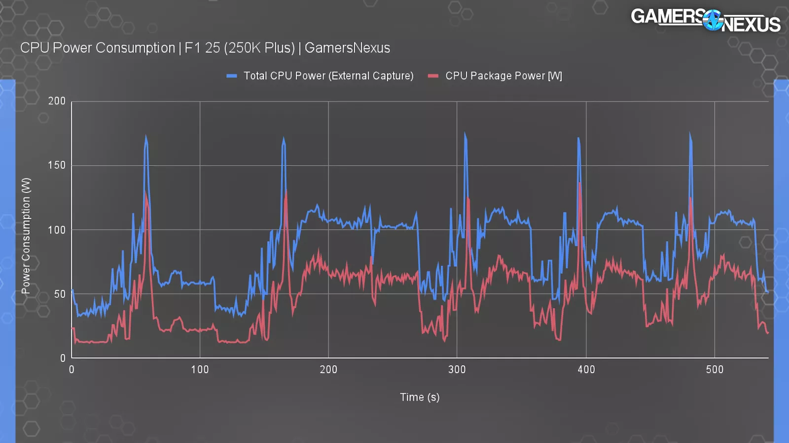 At F1 25 testing, you can see the loading screens and cycles with each of these spikes and dips. The peaks for externally captured power consumption landed at 171 watts with the valleys at 39 watts during low activity. During the game itself, such as around the 200 second to 270 second marks where we’re driving around the track, we saw around 100 watts from external capture. CPU package power was closer to 70 watts range via software readings. Our traditional power tests are complicated. They typically take two days of full time just to process the data and arrange it for performance per watt on charge. Plus, we need to do about a week of testing to get everything updated. So, for now, we’ll leave this one here just because of the time, but we may revisit it later.