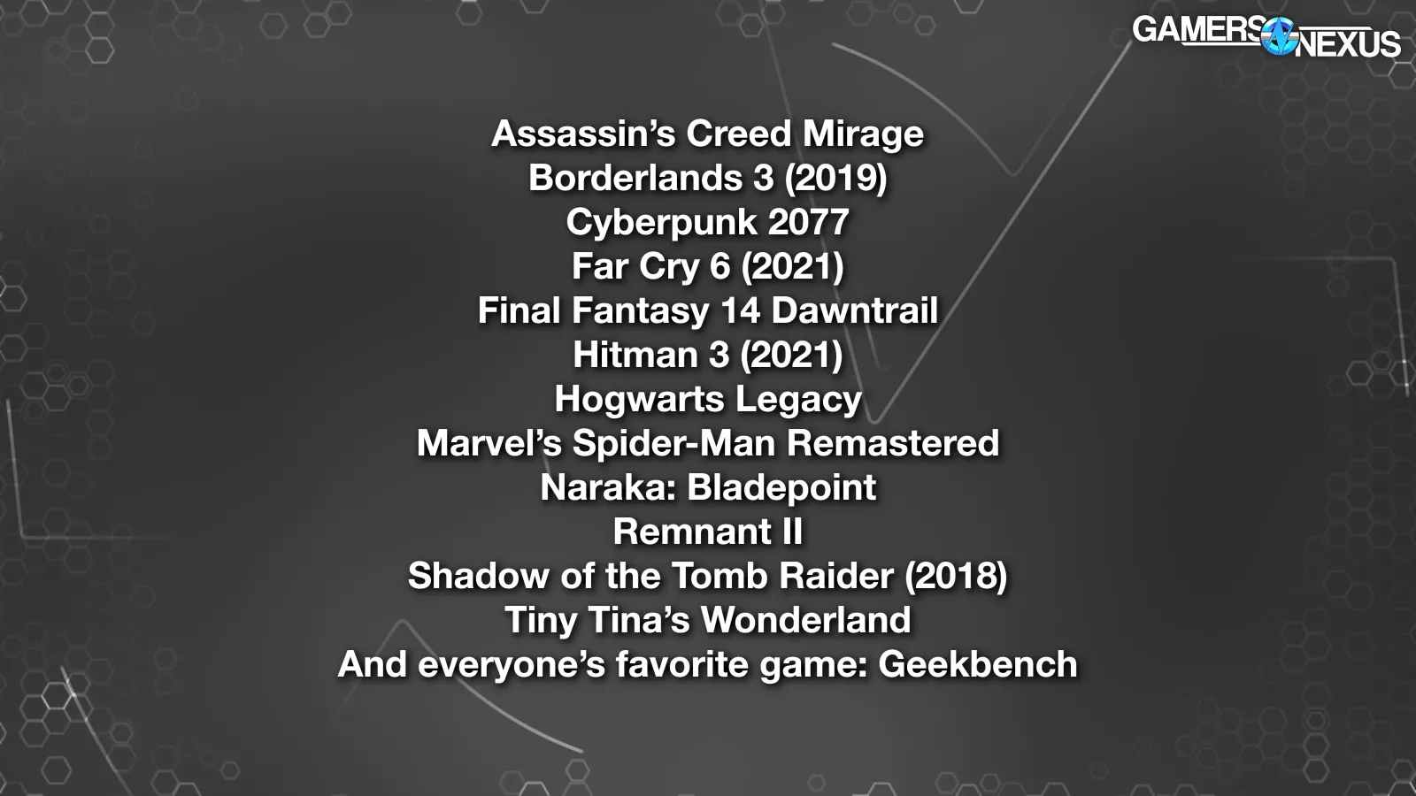 Assassin’s Creed MirageBorderlands 3 (2019)Cyberpunk 2077Far Cry 6 (2021)Final Fantasy 14 DawntrailHitman 3 (2021)Hogwarts LegacyMarvel’s Spider-Man RemasteredNaraka: BladepointRemnant IIShadow of the Tomb Raider (2018)Tiny Tina’s WonderlandAnd everyone’s favorite game: Geekbench
