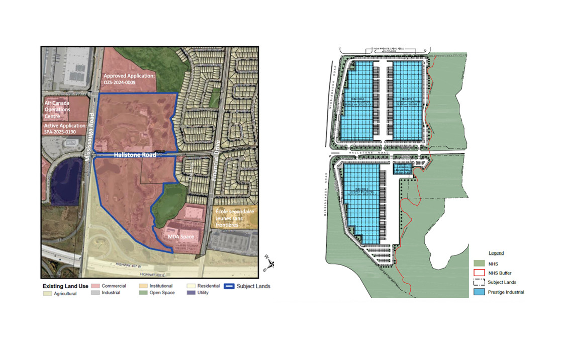 Kaneff Properties has submitted an application to rezone 1876 and 1990 Hallstone Road–approximately 17 hectares of land–to allow four industrial buildings and parking lots. The proposal would replace the existing golf course and the gas station at the northern corner of Mississauga Road and Hallstone Road. The majority of the property sits within the “regulated area” of the Credit Valley Conservation Authority, which signals it is vulnerable to erosion and flooding.