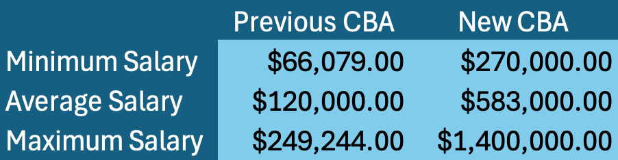 The new CBA provides players with significant salary increases, establishes revenue sharing, and provides many other benefits. The salary cap is rising from $1.5 million to a staggering $7 million, leading to greatly increased salaries for players at all stages of their careers.
