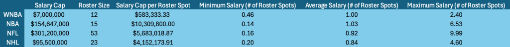 The monetary value of a roster spot is the salary cap divided by the roster size. This number is approximately average salary, and it defines how much money can be spent, on average, for each roster spot without going over the salary cap. The WNBA stands out with a minimum salary player earning more than twice as much (0.46 roster spots vs. 0.20 roster spots) relative to their peers in any of the other leagues. A player with a maximum salary in the other leagues also outpaces their peers by almost double what a supermax player in the WNBA earns compared to their peers (4.60 roster spots vs. 2.40 roster spots).