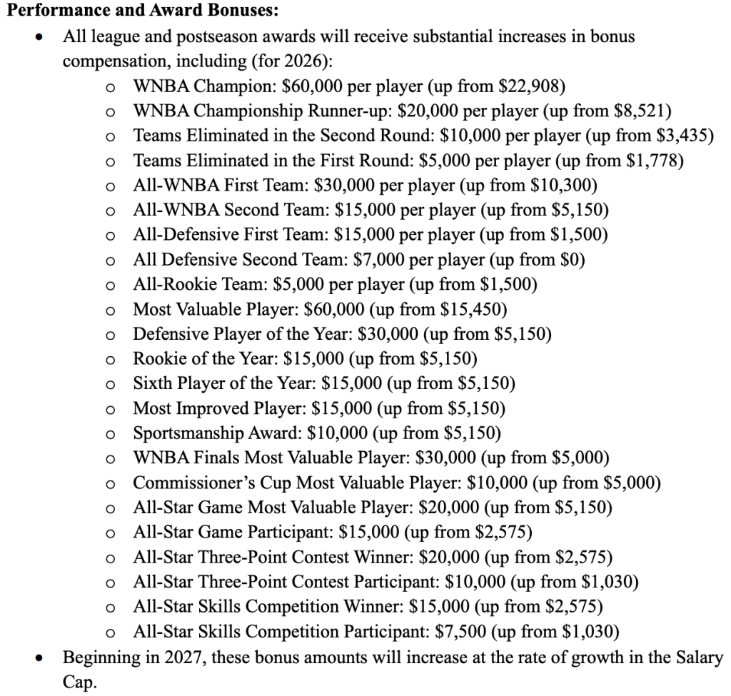 This list displays the updates to player performance and award bonuses (Photo courtesy of the WNBPA).