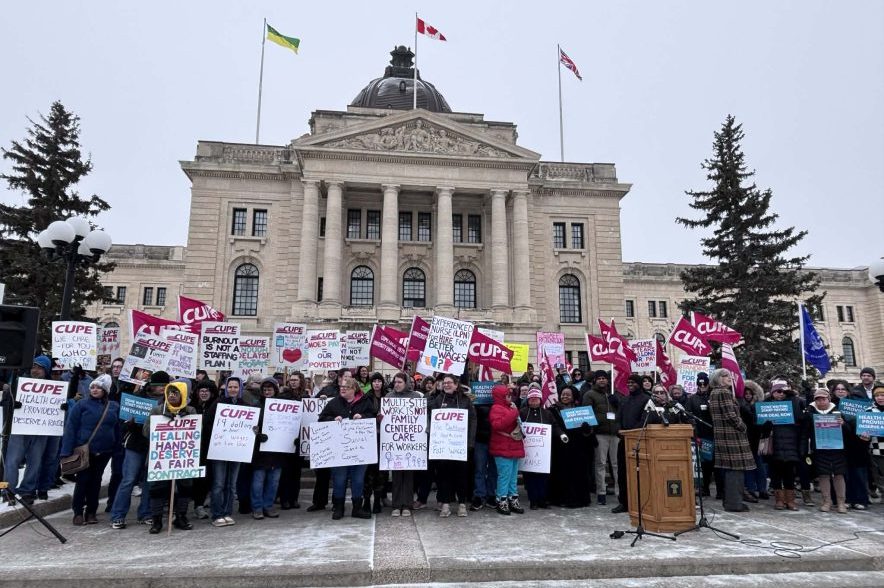 Health care workers who haven’t received a raise in years chanted and waved flags outside of the Legislative Building on Wednesday.