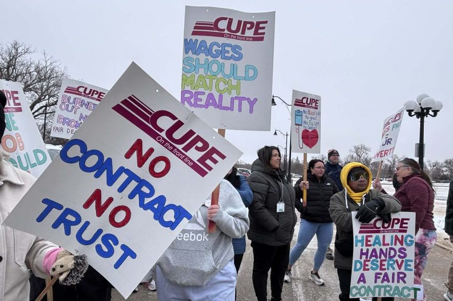 Members with CUPE Heath Care Workers held signs with phrases like “burnout caused this turnout.” The protest came more than three years after contract negotiations stalled.