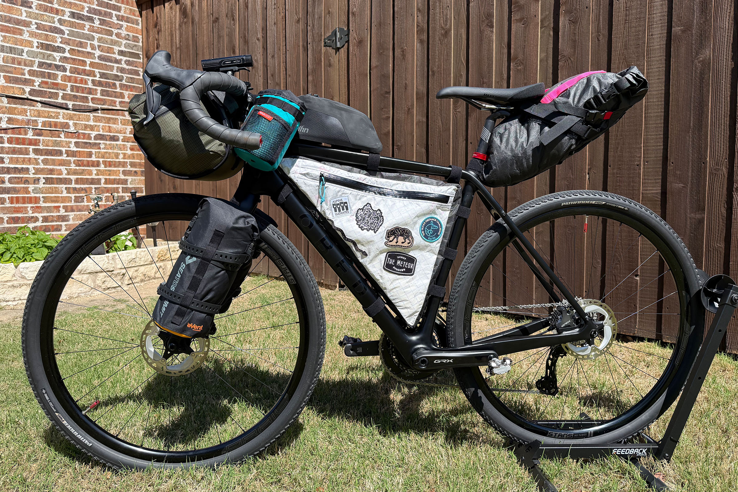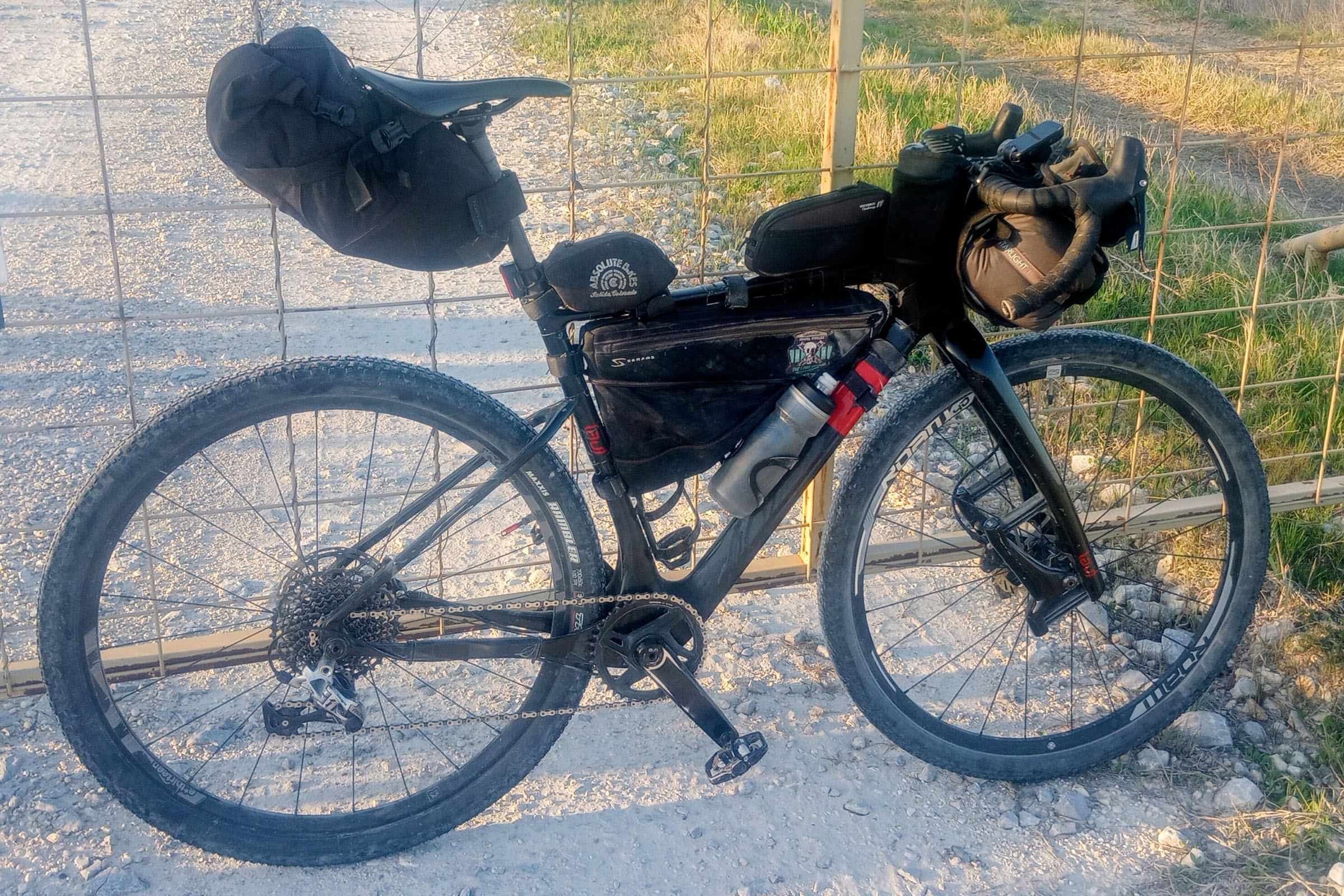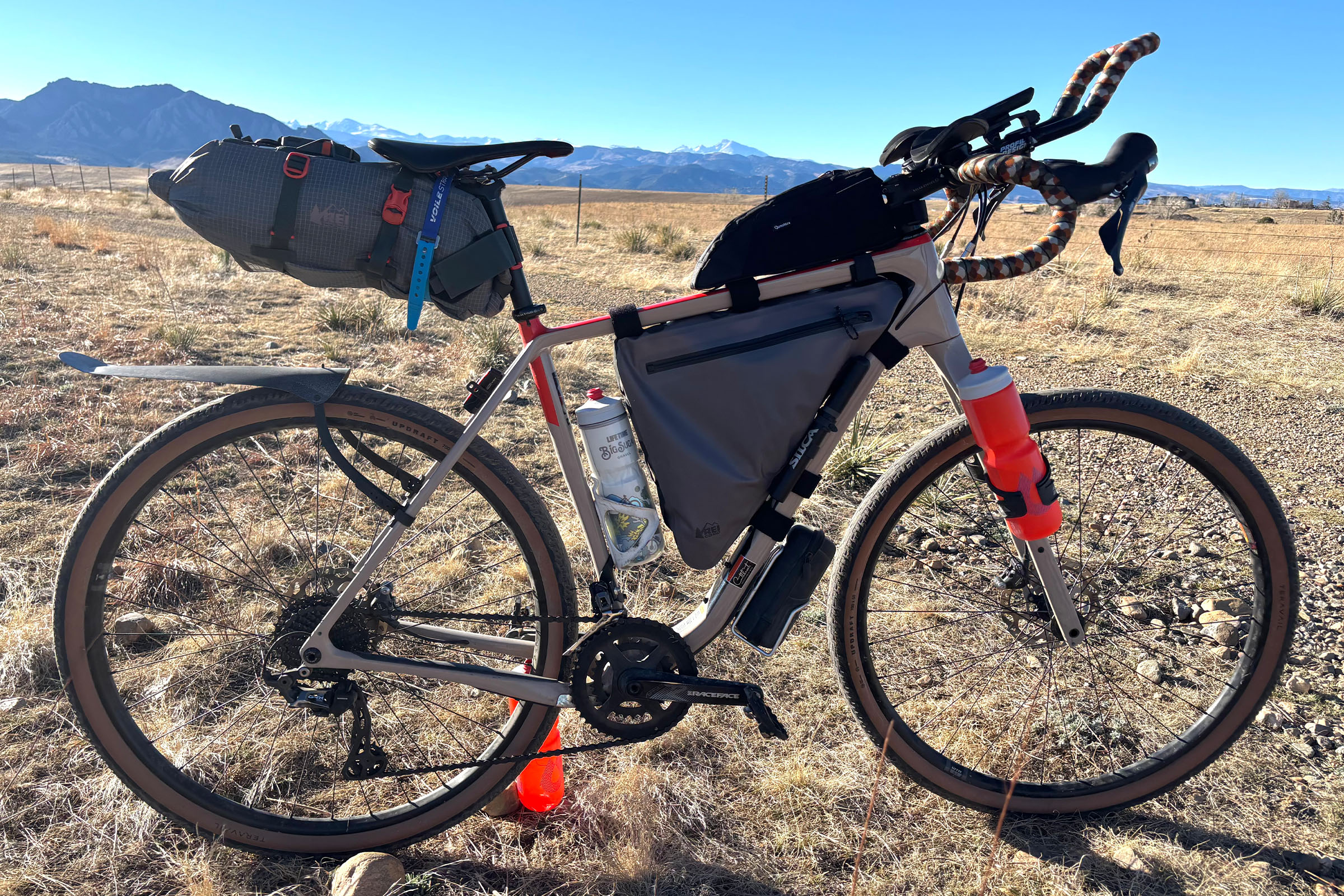 BAGS: I have a REI Link frame bag and seat pack, with a top tube bag for holding snacks and a battery pack. I’ll bring 3 bottles with me as well.