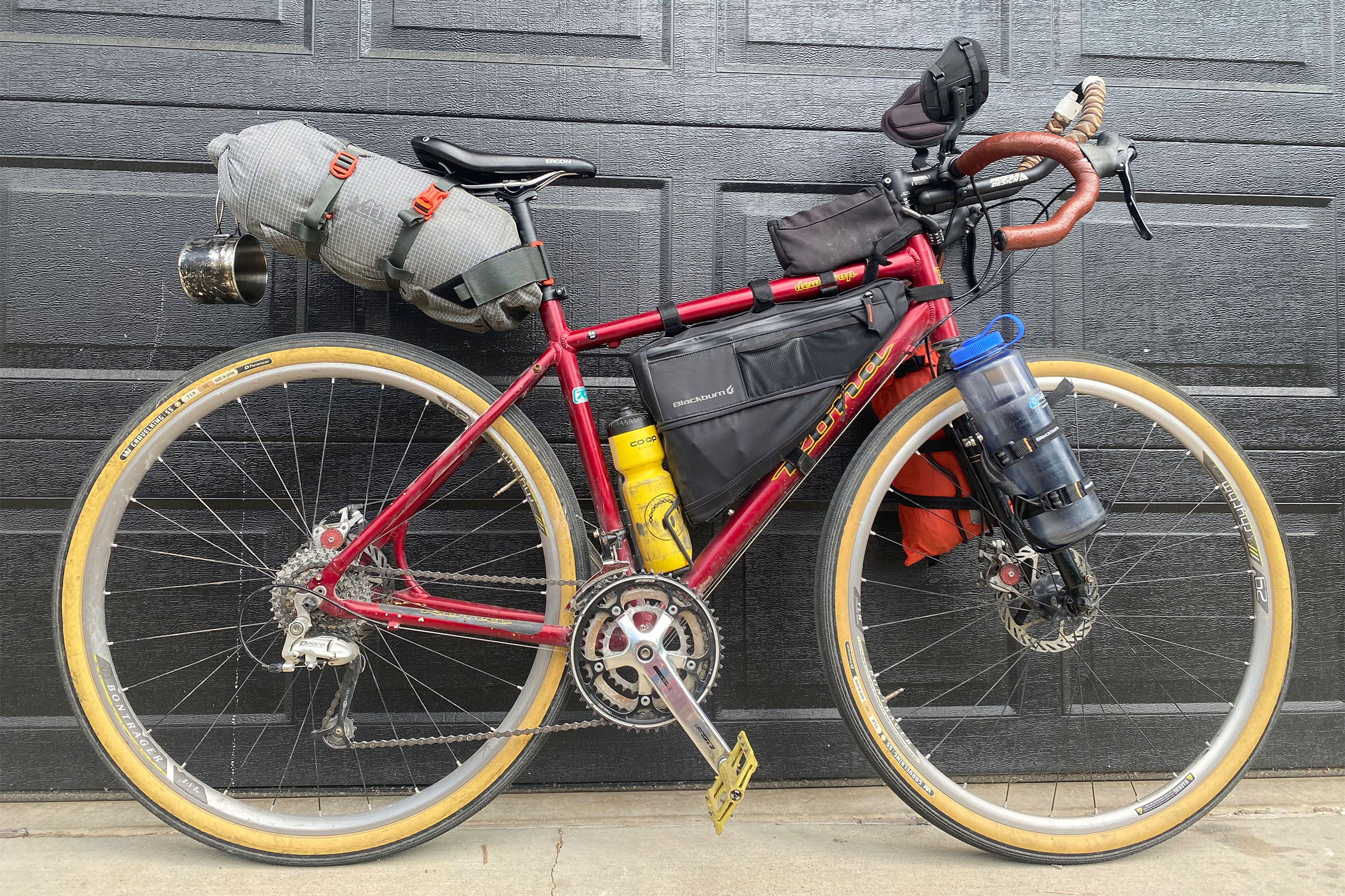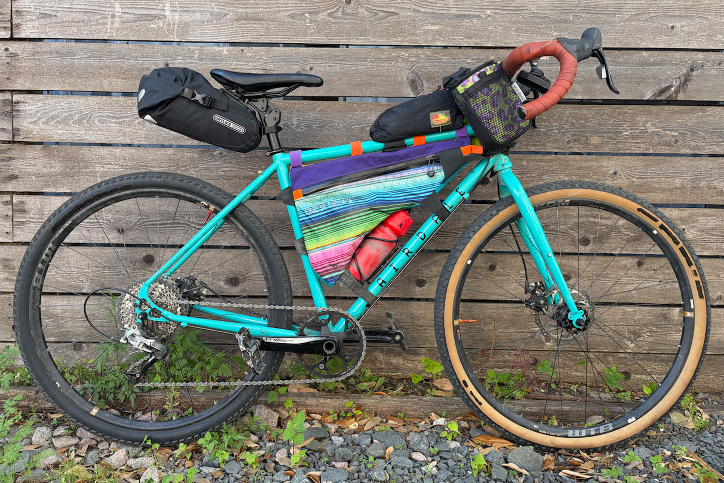 BAGS: I use a Rockgeist Loop Bar Harness with their double-ended dry bag, a Swift Hold Fast Frame Bag, a pair of North St. Micro Panniers, and a Randi Jo Bartender for snacks and beverages.