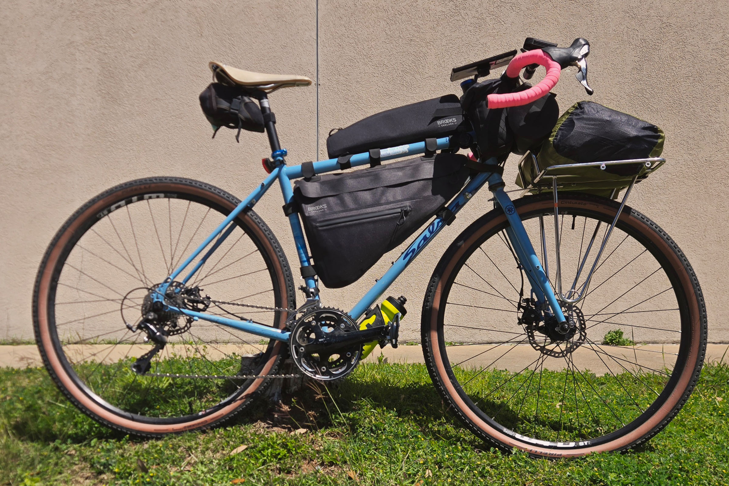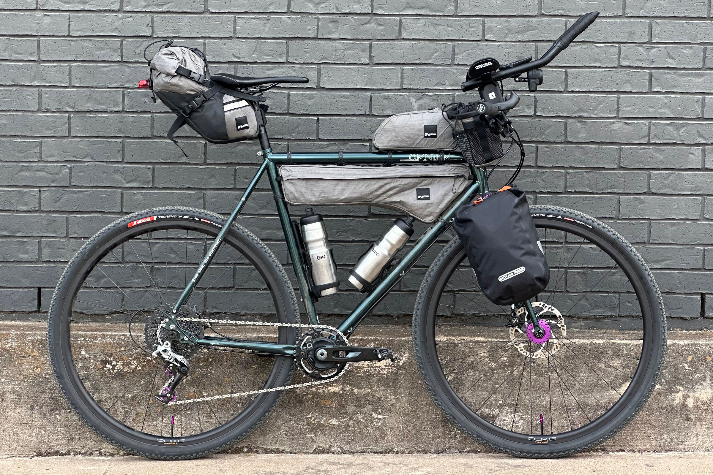 BAGS: Oveja Negra Superwedgie frame bag, Rogue Panda Alamo top tube bag, Ortlieb fork packs, and compression bag on a Tumbleweed rack.