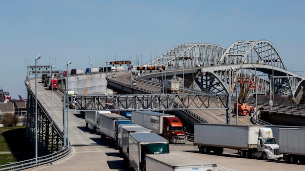 A truck crosses the Blue Water Bridge into Port Huron, Mich., from Sarnia, Ont., on Mar. 18, 2020. (Paul Sancya/Associated Press)