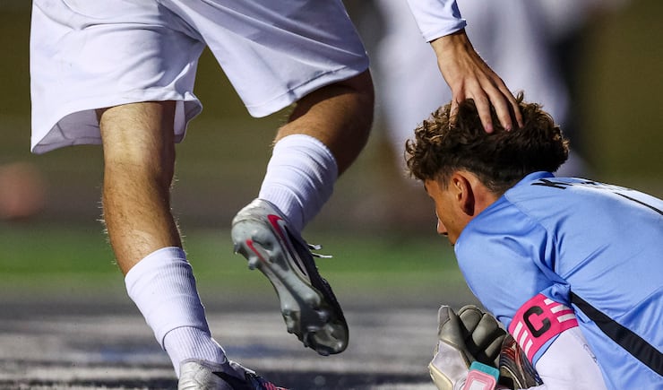 A player pats Lone Peak goalkeeper Sam Parker (1) on the head after making a save during the second half of a soccer match against Corner Canyon at Corner Canyon High School in Draper on Friday, March 27, 2026. | Rio Giancarlo, Deseret News