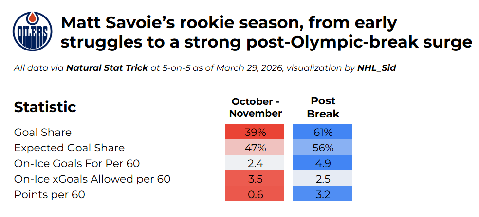Initially, Savoie had a rough start to 2025-26, his first full NHL season. He recorded just a single point through his first 11 games, and by the end of November, no Oiler forward was on ice for more (even-strength) scoring chances against per 60 minutes than Savoie. There were certainly flashes of talent, but the underlying results at both ends of the ice were, frankly, quite dreadful.
