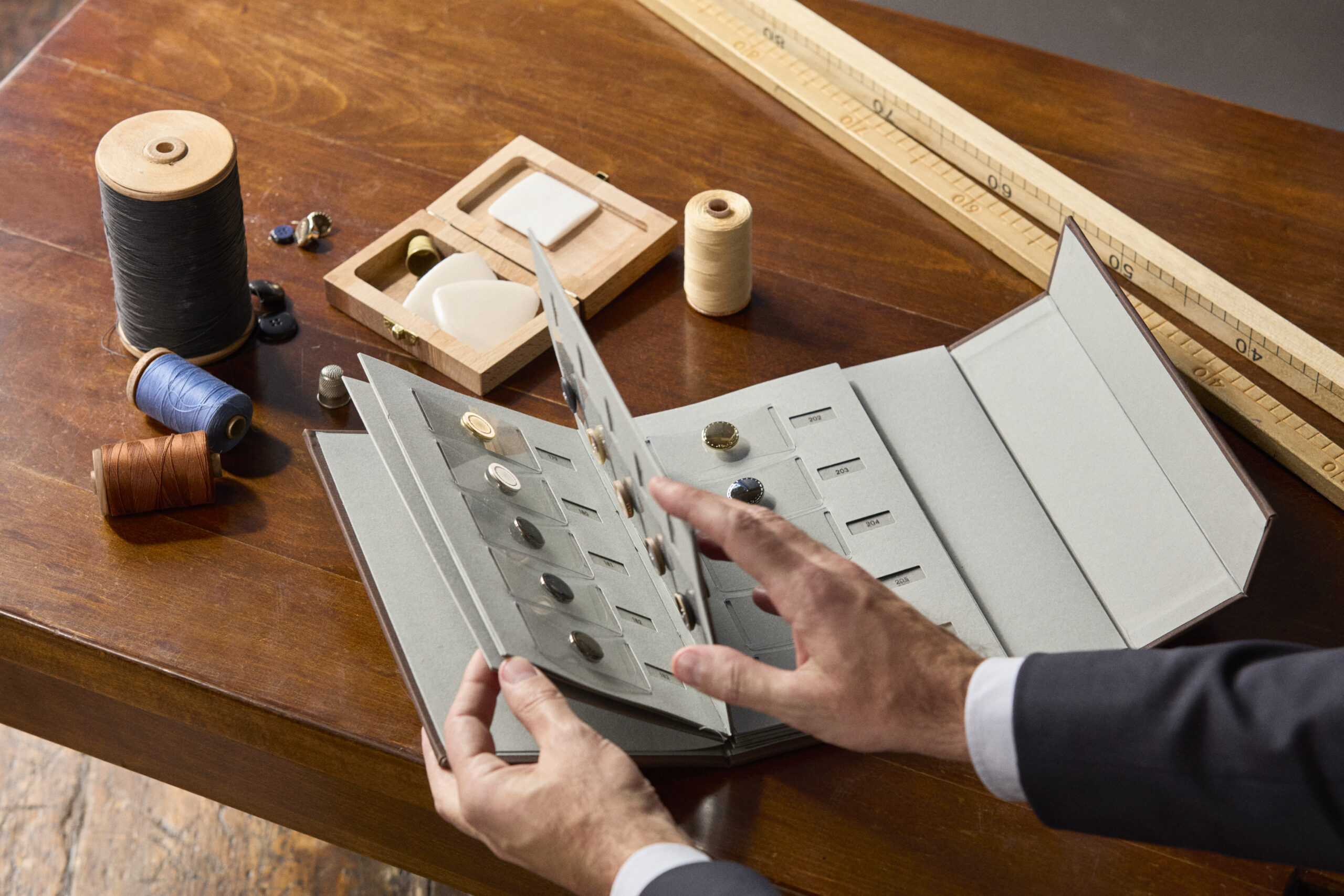 Clients can choose from over 500 fabrics, spanning both seasonal and permanent collections, along with 250 shirting fabrics, 20 collar styles, and 10 knitwear patterns crafted from premium yarns such as cashmere, Sea Island cotton, and refined cashmere/silk/wool blends.
