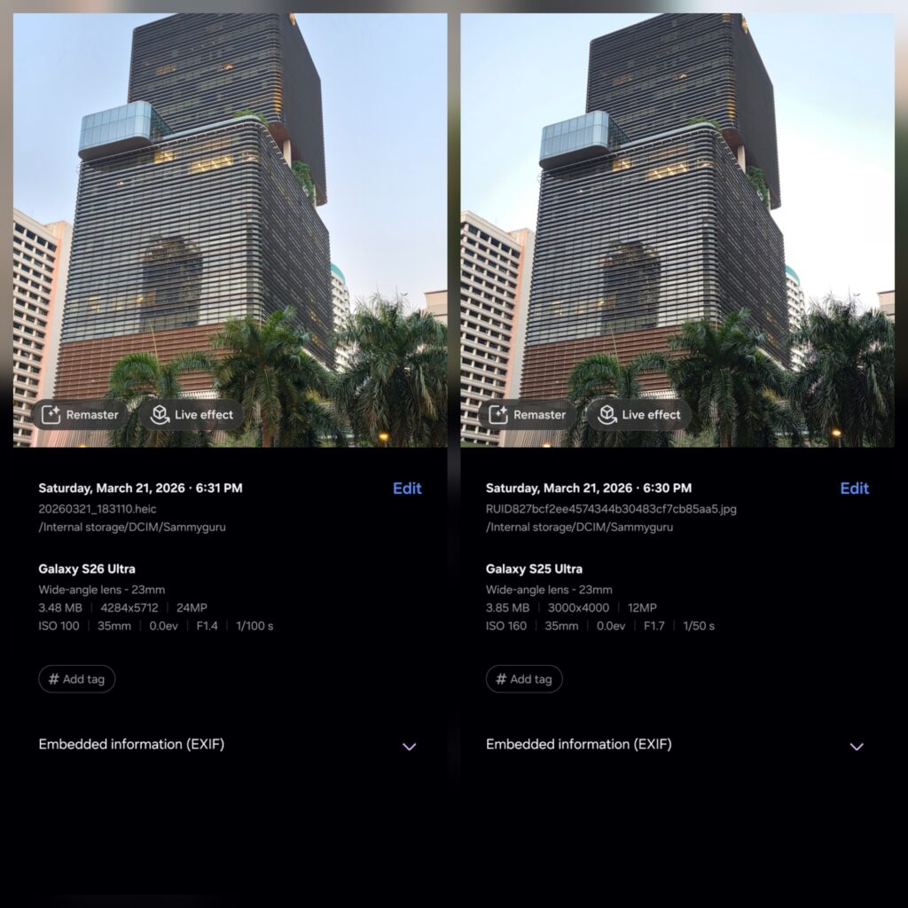 This is a major shift from the Galaxy S25 Ultra, where high-resolution behavior was largely limited to Expert RAW. In Auto mode, the system stayed locked to 12MP output across most zoom levels, even when more detail was available from the sensor.