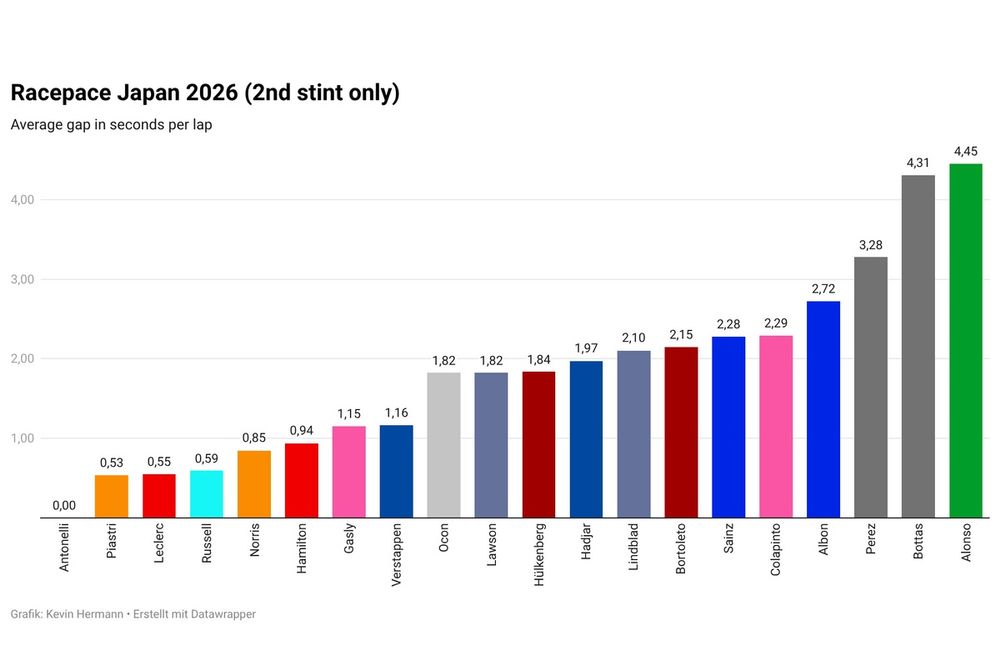 Mercedes’ superiority became particularly evident in the second stint. In clean air, Antonelli was on average around half a second per lap faster than the competition on comparable tyre age.