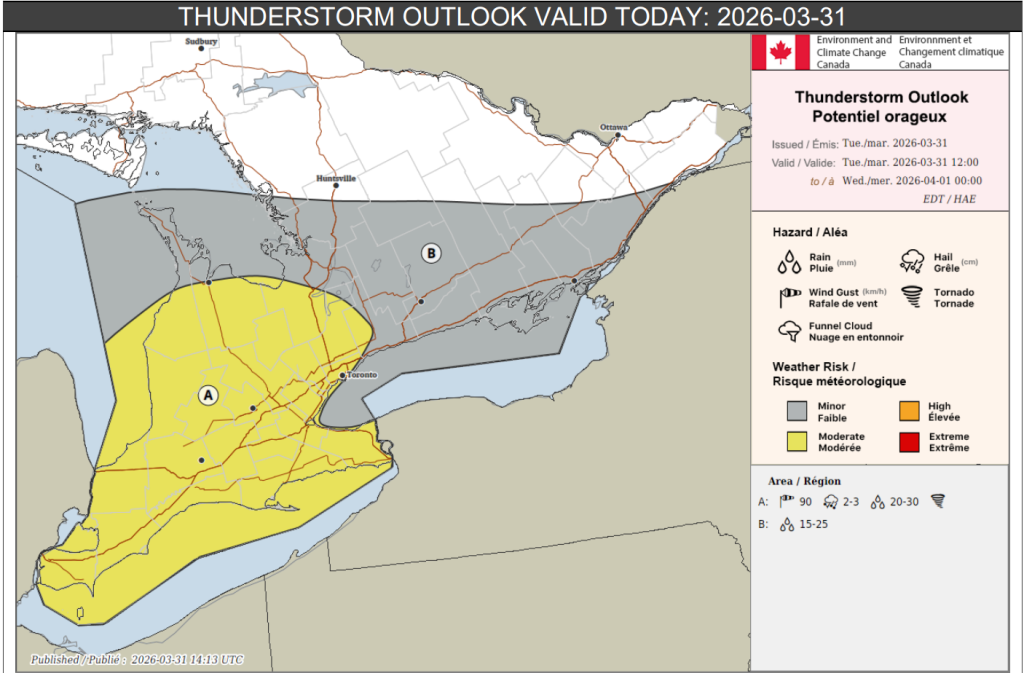 Environment Canada issued a thunderstorm outlook for Tuesday which says that southwestern Ontario and portions of the Golden Horseshoe (location A on the map below) will see the worst of it.