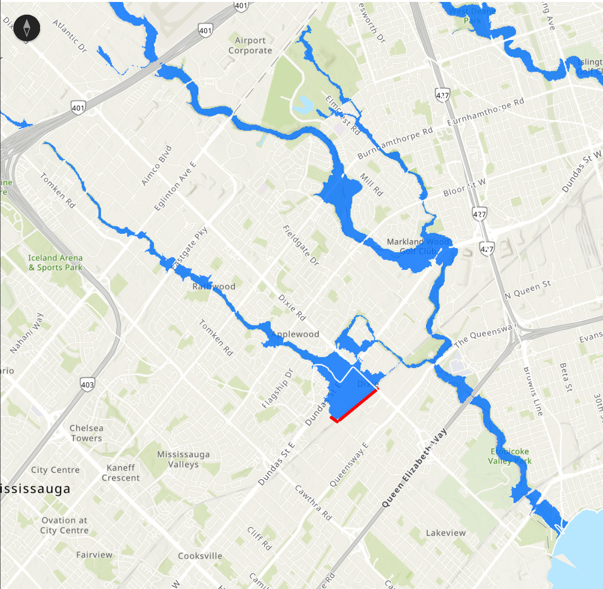 A map of the flood prone areas around the City of Mississauga. The Dixie-Dundas neighbourhood sits in a low-lying area and often sees flooding when Little Etobicoke Creek overflows its banks.
